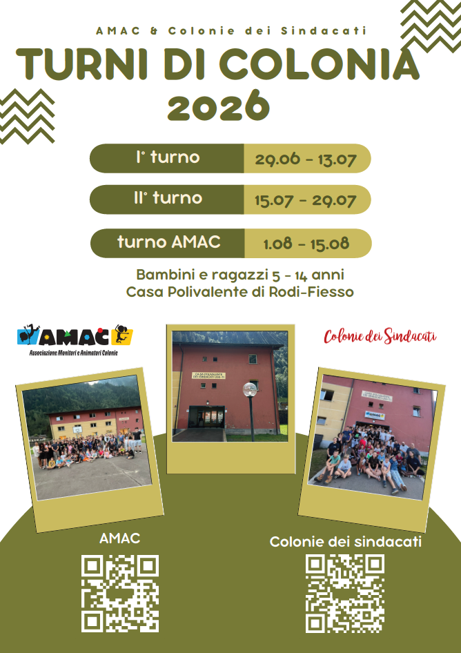 da venerdì 1° agosto a venerdì 15 agosto 2025Maggiori informazioni sulla nostra pagina “Turni colonie” cliccando qui.